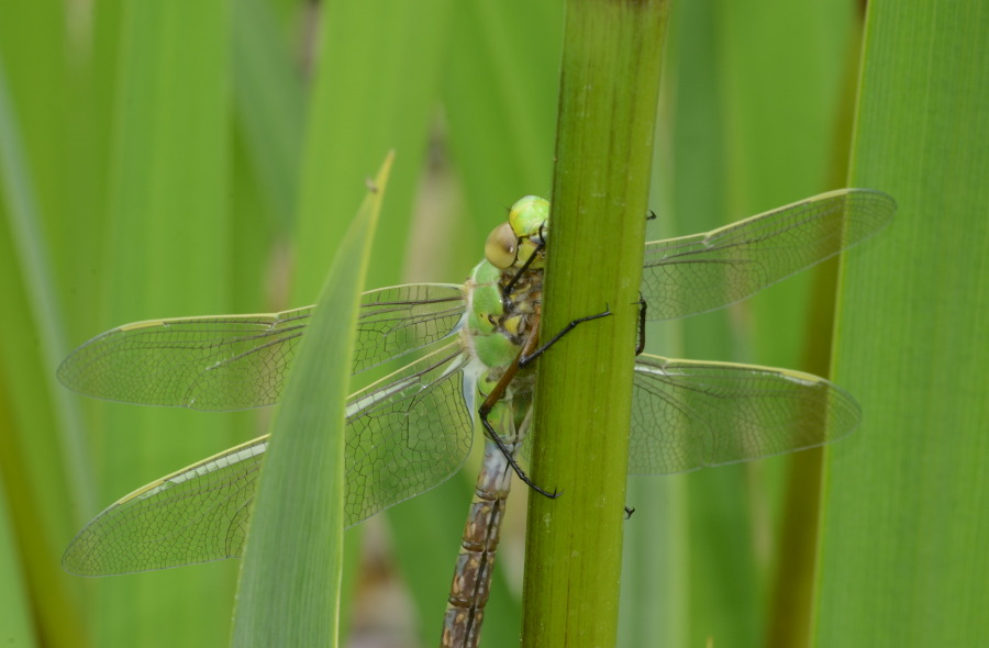 Unter anderem ist es mir gelungen, einen kompletten Schlüpfvorgang der blaugrünen Mosaikjungfer (Libelle) fotografisch zu dokumentieren. Die Larve verlässt in lauen Juni-Sommernächten das Wasser und steigt an einer Pflanze empor. Dort befreit sie sich aus der Larvenhülle und entfaltet sich zum Fluginsekt. Dieser Vorgang zieht sich letztendlich über mindestens drei Stunden hin. Libellen haben mich schon immer mit ihren Flugkünsten begeistert. Mit voller Geschwindigkeit über das Wasser fliegend oder verharrend auf einer Stelle in der Luft – ein faszinierendes Schauspiel.